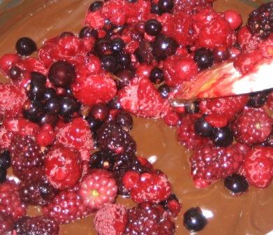 - Carefully drain off the crème de cassis and pour over the chocolate caramel fruit mixture.