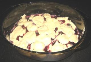 - Now drop spoonfuls of the remaining sponge mixture over the fruit. You will be able to see the fruit between the spoonfuls of sponge mix.